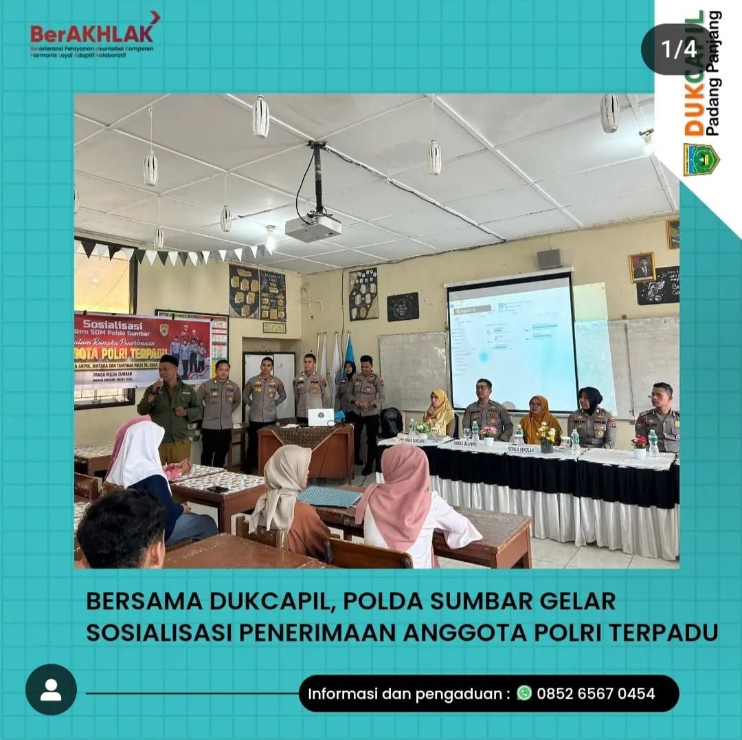 BERSAMA DUKCAPIL, POLDA SUMBAR GELAR SOSIALISASI PENERIMAAN ANGGOTA POLRI TERPADU Operator DISDUKCAPIL Senin, 04-03-2024 Dinas Kependudukan dan Pencatatan Sipil Kota Padang Panjang menghadiri kegiatan Sosialisasi Pener Read More