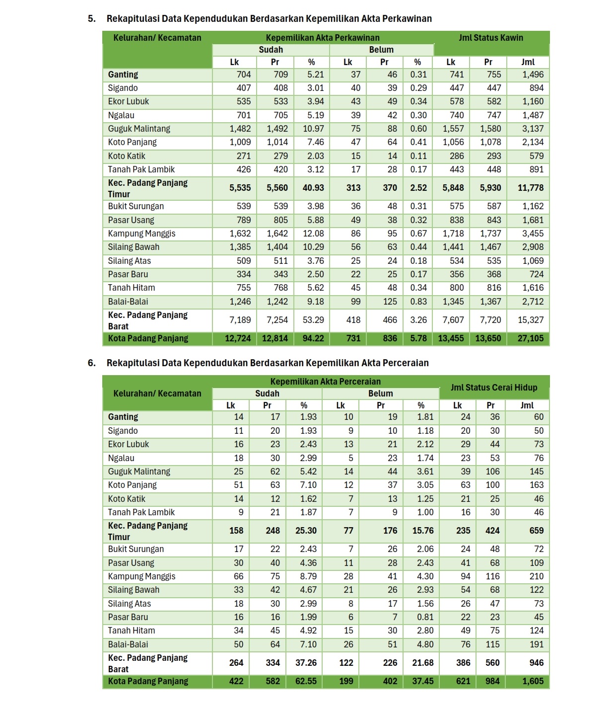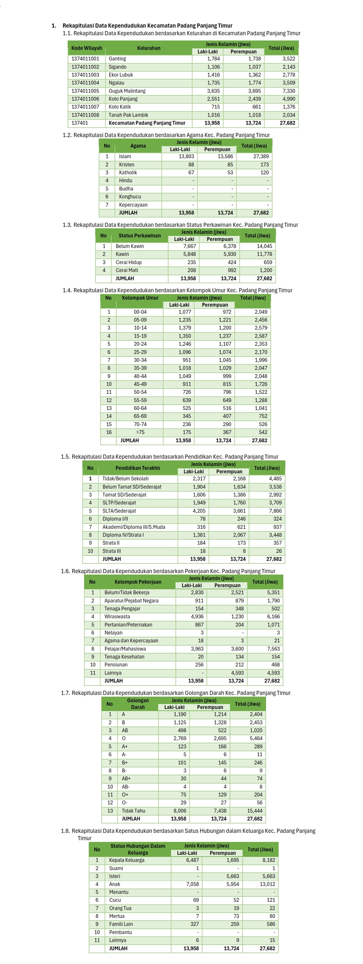 Kuantitas Penduduk Rekapitulasi Data Kependudukan Kota Padang Panjang Smt II Tahun 2024 Rekapitulasi Data Kependudukan Kecamatan Padang Panjang Timur Rekapitulasi Data Kependudukan Kecamatan Padang Panjang Barat Rekapitulasi Data Kependudukan Kelurahan Ganting Rekapitulasi Data Kependudukan Kelurahan Sigando Rekapitulasi Data Kependudukan Kelurahan Ekor Lubuk Rekapitulasi Data Kependudukan Kelurahan Ngalau Rekapitulasi Data Kependudukan Kelurahan Guguk Malintang Rekapitulasi Data Kependudukan Kelurahan Koto Panjang Rekapitulasi Data Kependudukan Kelurahan Koto Katik Rekapitulasi Data Kependudukan Kelurahan Tanah Pak Lambik Rekapitulasi Data Kependudukan Kelurahan Bukit Surungan Rekapitulasi Data Kependudukan Kelurahan Pasar Usang Rekapitulasi Data Kependudukan Kelurahan Kampung Manggis Rekapitulasi Data Kependudukan Kelurahan Silaing Bawah Rekapitulasi Data Kependudukan Kelurahan Silaing Atas Rekapitulasi Data Kependudukan Kelurahan Pasar Baru Rekapitulasi Data Kependudukan Kelurahan Tanah Hitam Rekapitulasi Data Kependudukan Kelurahan Balai Balai Rekapitulasi Data Kependudukan Kota Padang Panjang per RT Kuantitas Keluarga Kepemilikan Dokumen Rekapitulasi Data Kependudukan Berdasarkan Kepemilikan Kartu Keluarga Rekapitulasi Data Kependudukan Berdasarkan Kepemilikan Kartu Identitas Anak Rekapitulasi Data Kependudukan Berdasarkan Kepemilikan KTP elektronik Rekapitulasi Data Kependudukan Berdasarkan Kepemilikan Akta Kelahiran Rekapitulasi Data Kependudukan Berdasarkan Kepemilikan Akta Perkawinan dan Akta Perceraian