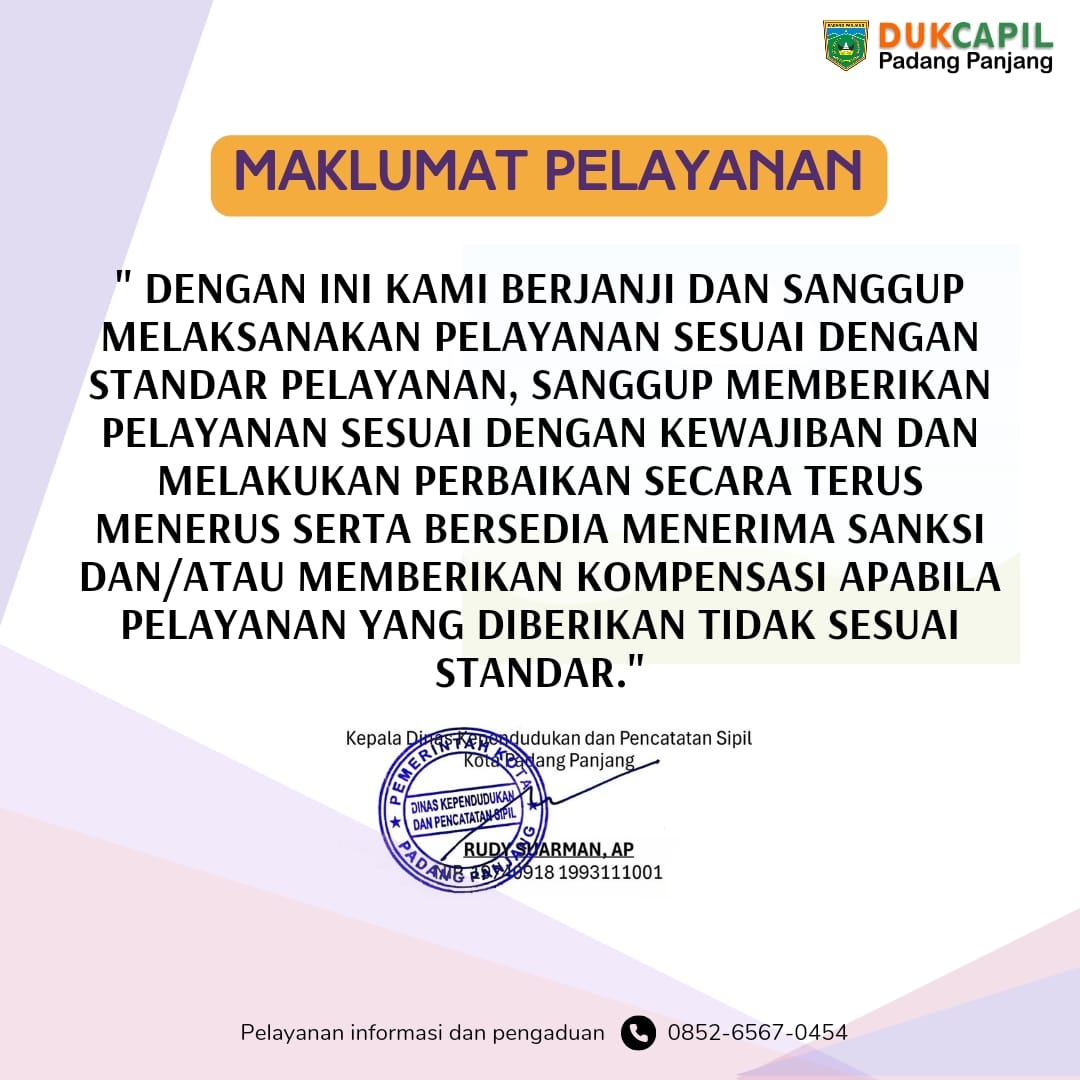 Dengan ini kami berjanji dan sanggup melaksanakan pelayanan sesuai dengan standar pelayanan, sanggup memberikan pelayanan sesuai dengan kewajiban dan akan melakukan perbaikan secara terus menerus serta bersedia menerima sanksi dan/ atau memberikan kompensasi apabila pelayanan yang diberikan tidak sesuai standar