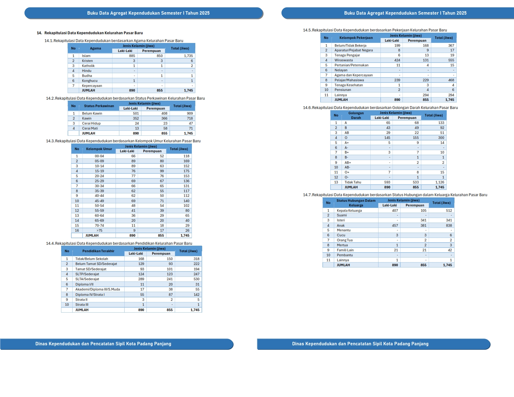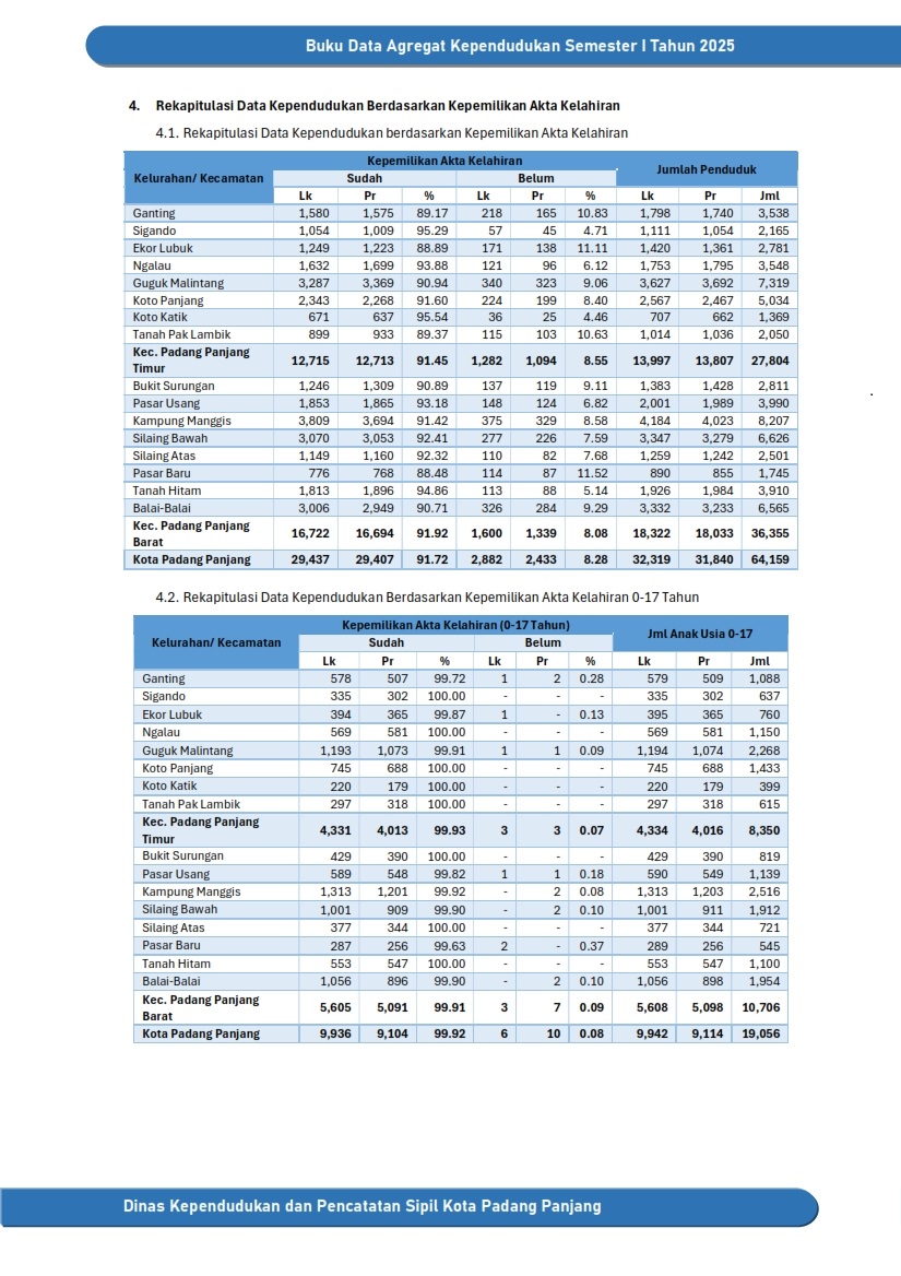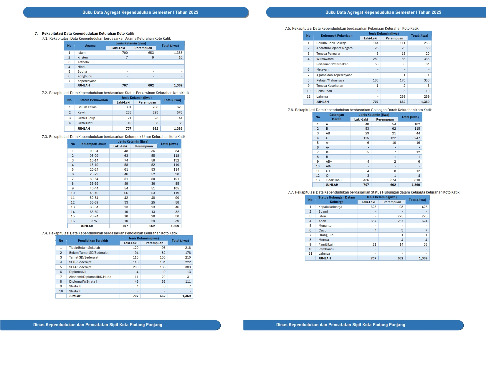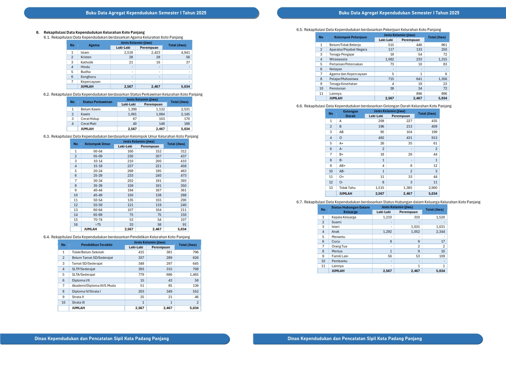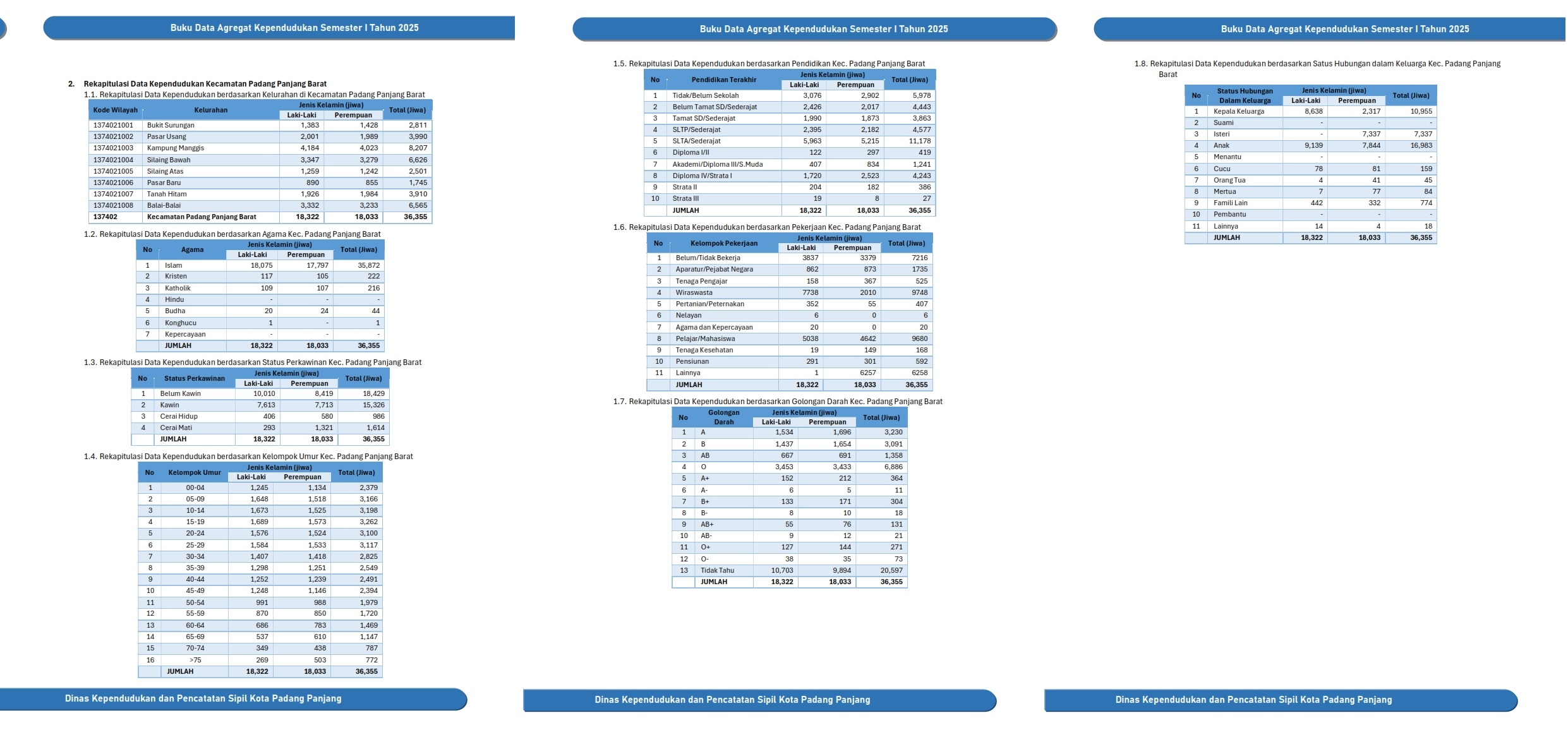 Kuantitas Penduduk Rekapitulasi Data Kependudukan Kota Padang Panjang Smt I Tahun 2025 Rekapitulasi Data Kependudukan Kota Padang Panjang Smt I Tahun 2025 Rekapitulasi Data Kependudukan Kota Padang Panjang Smt I Tahun 2025 Rekapitulasi Data Kependudukan Kecamatan Padang Panjang Timur Rekapitulasi Data Kependudukan Kecamatan Padang Panjang Barat Rekapitulasi Data Kependudukan Kelurahan Ganting Rekapitulasi Data Kependudukan Kelurahan Sigando Rekapitulasi Data Kependudukan Kelurahan Ekor Lubuk Rekapitulasi Data Kependudukan Kelurahan Ngalau Rekapitulasi Data Kependudukan Kelurahan Guguk Malintang Rekapitulasi Data Kependudukan Kelurahan Koto Panjang Rekapitulasi Data Kependudukan Kelurahan Koto Katik Rekapitulasi Data Kependudukan Kelurahan Tanah Pak Lambik Rekapitulasi Data Kependudukan Kelurahan Bukit Surungan Rekapitulasi Data Kependudukan Kelurahan Pasar Usang Rekapitulasi Data Kependudukan Kelurahan Kampung Manggis Rekapitulasi Data Kependudukan Kelurahan Silaing Bawah Rekapitulasi Data Kependudukan Kelurahan Silaing Atas Rekapitulasi Data Kependudukan Kelurahan Pasar Baru Rekapitulasi Data Kependudukan Kelurahan Tanah Hitam Rekapitulasi Data Kependudukan Kelurahan Balai Balai Rekapitulasi Data Kependudukan Berdasarkan RT Kuantitas Keluarga Kepemilikan Dokumen Rekapitulasi Data Kependudukan Berdasarkan Kepemilikan Kartu Keluarga Rekapitulasi Data Kependudukan Berdasarkan Kepemilikan Kartu Identitas Anak Rekapitulasi Data Kependudukan Berdasarkan Kepemilikan Akta Perkawinan dan Perceraian Rekapitulasi Data Kependudukan Berdasarkan Kepemilikan KTP Elektronik Rekapitulasi Data Kependudukan Berdasarkan Kepemilikan Akta Kelahiran