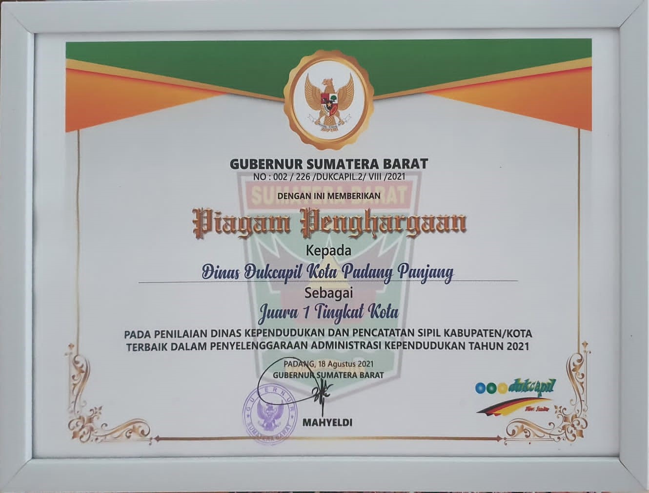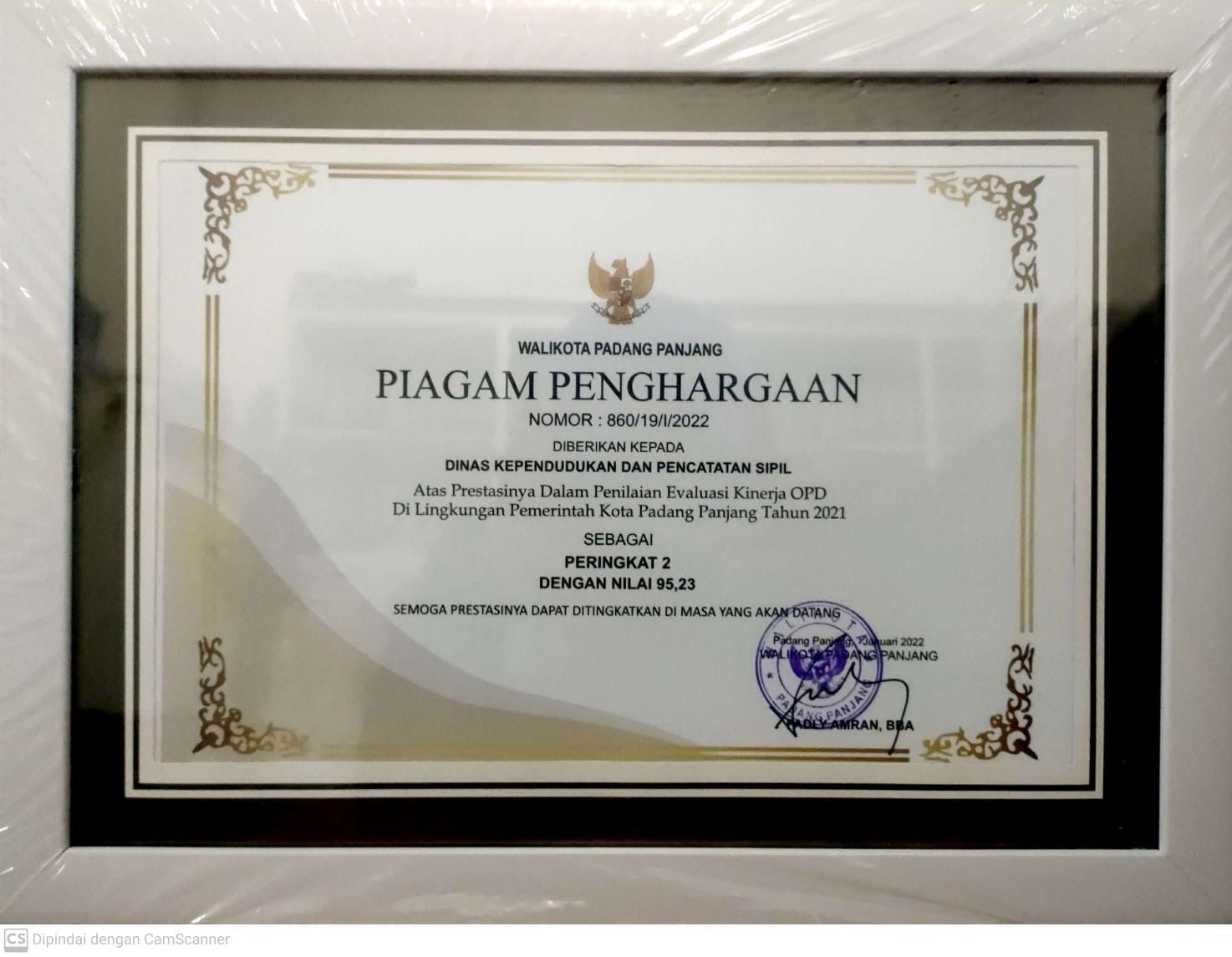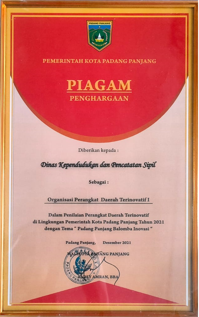 Piagam Penghargaan Sebagai Peringkat I Tingkat Kota pada Peniliain Dinas Kependudukan dan Pencatatan Sipil Kabupaten / Kota Terbaik dalam Penyelenggaraan Administrasi Kependudukan Tahun 2021