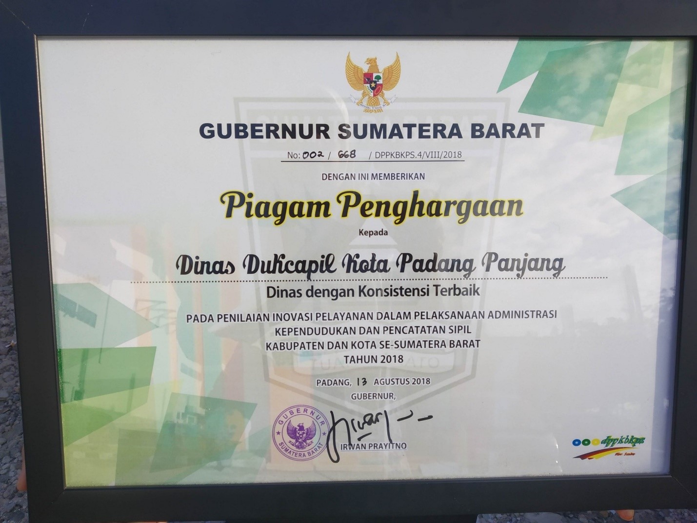 PENGHARGAAN dari BPS Provinsi Sumatera Barat sebagai OPD dengan kategori Koordinasi Sangat Baik dan Partisipasi ASN Tercepat dalam pelaksanaan Sensus Penduduk Online Tahun 2020 di Kota Padang Panjang (2020)